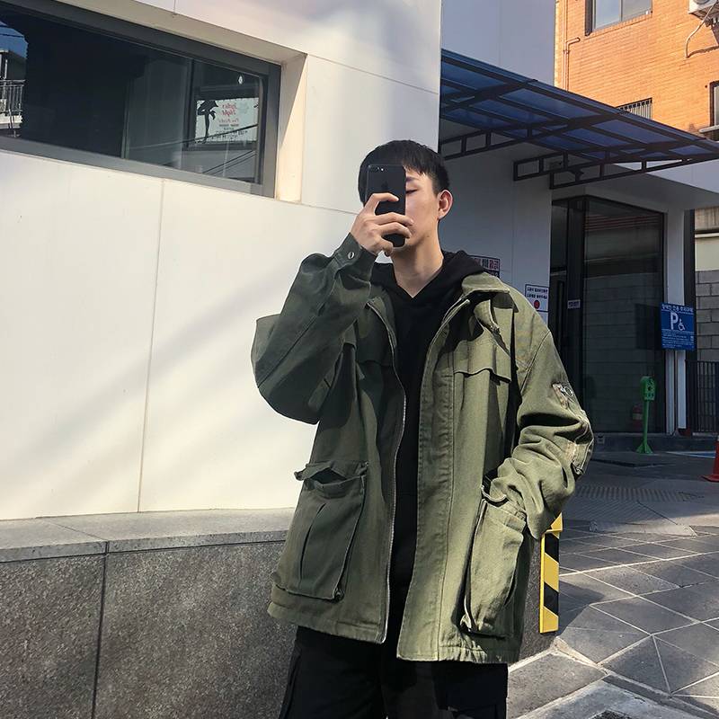 方寸先生男士秋冬季2018新款韩版潮流夹克港风chic军绿色加厚外套