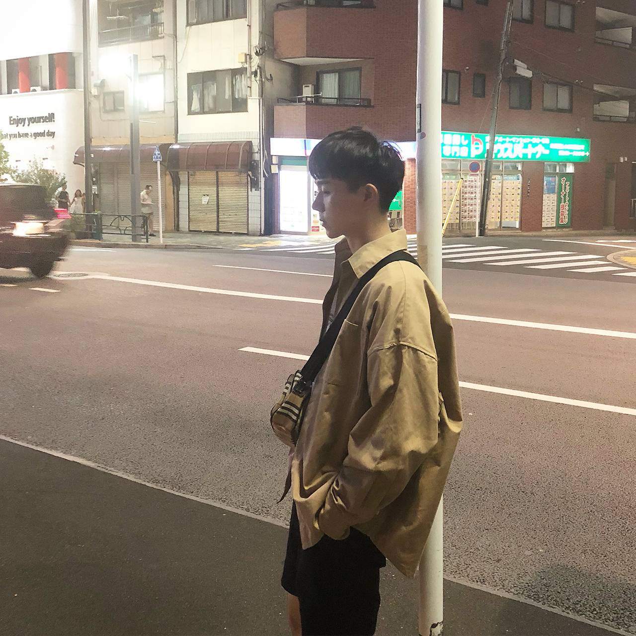 方寸先生秋季长袖宽松网红衬衫男韩版休闲港风衬衣潮流卡其色外套