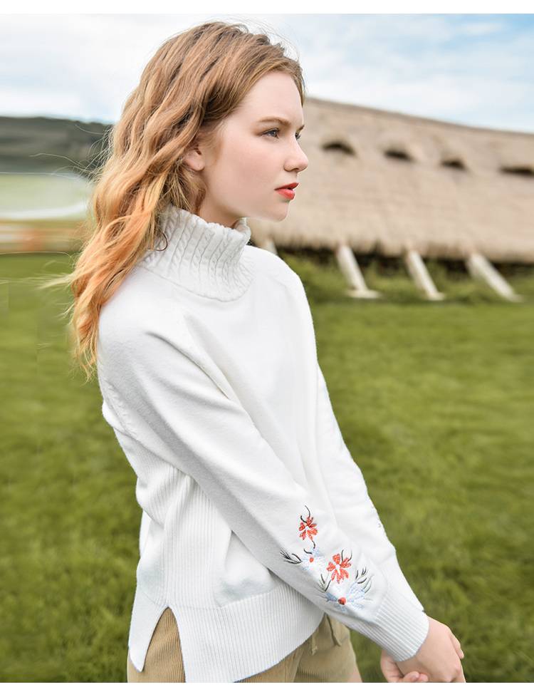 尼班诗2018冬装新款女装上衣白色慵懒风刺绣毛衣女针织衫