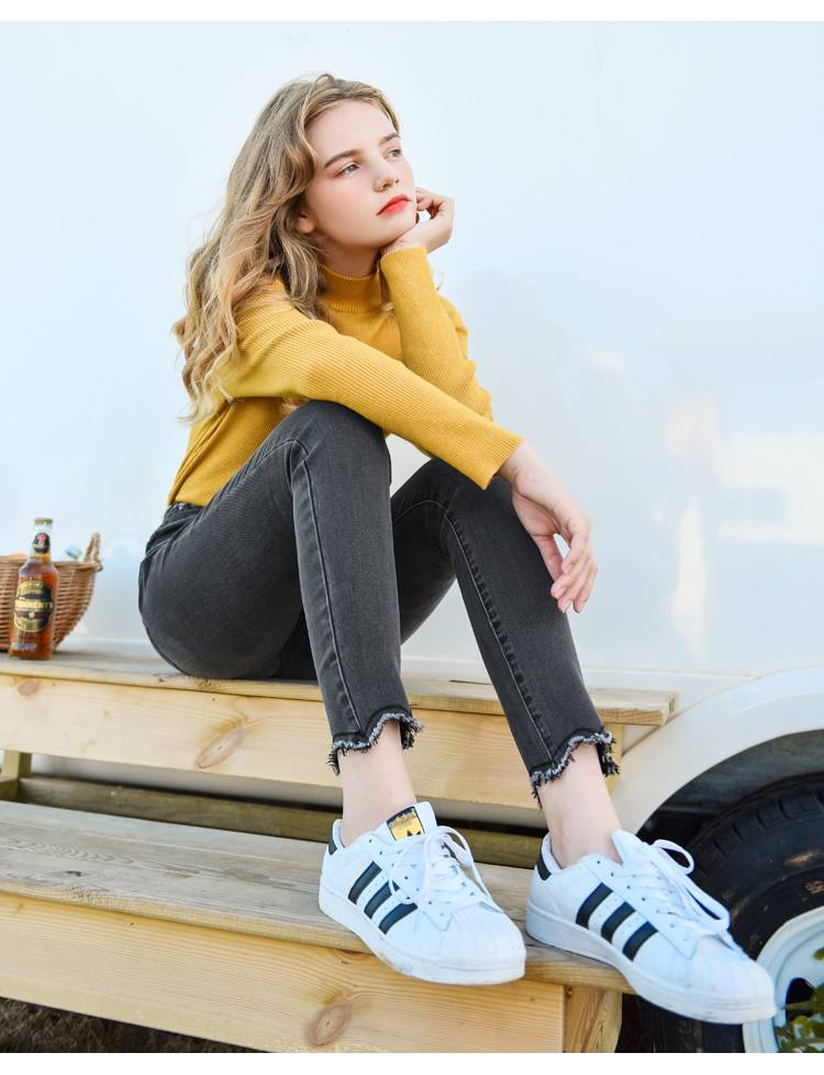 尼班诗2018冬装新款女装高腰修身毛边小脚铅笔牛仔裤女长裤