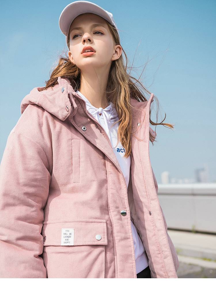 尼班诗2018冬装新款灯芯绒宽松显瘦加厚中长款连帽棉衣学生