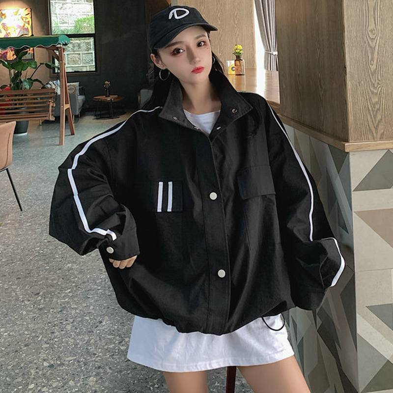春季2021新款韩版宽松bf港风夹克上衣百搭炸街休闲黑色工装外套女