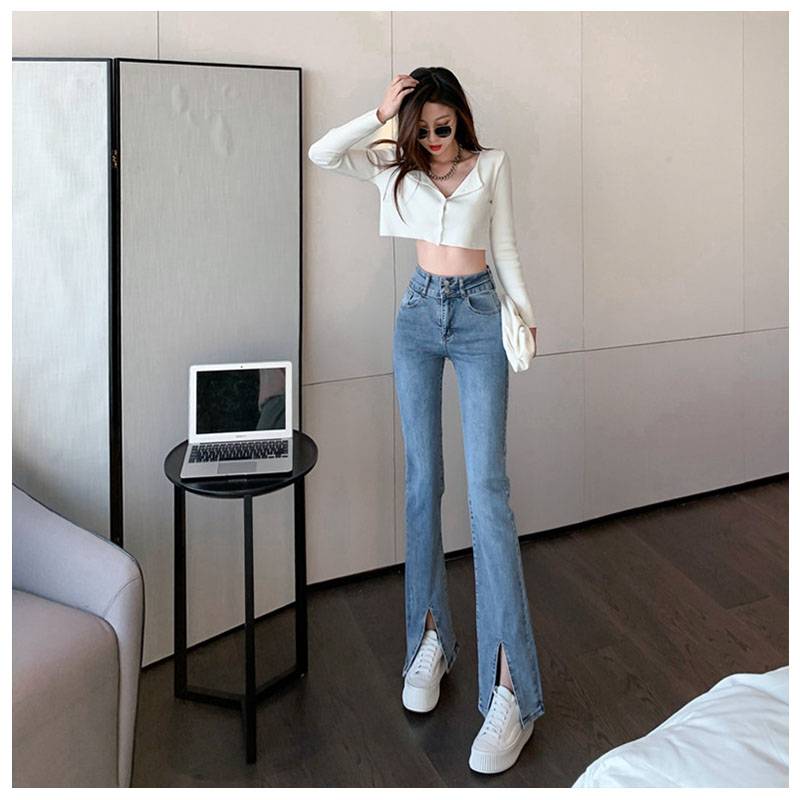 开叉牛仔裤女2021年新款修身高腰微喇裤子直筒显瘦长裤喇叭阔腿裤