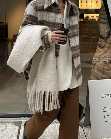 2021年冬季新品韩版气质显瘦百搭款格纹长袖羊毛衬衫上衣外套