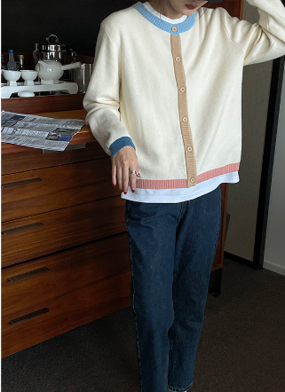 秋冬韩版小众设计感99%羊毛针织开衫小香风圆领撞色毛衣女外套ins