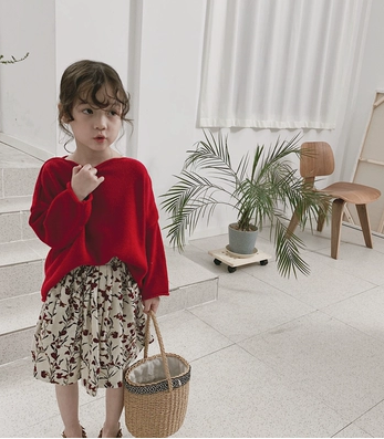 韩国童装2019春季新款女童红色气质圆领毛衣+时尚花朵碎花半身裙