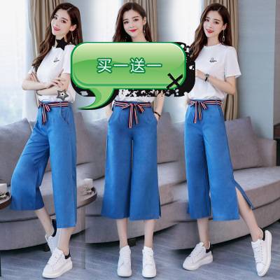 2019夏装新款女装牛仔裤阔腿裤套装气质潮时尚矮个子裙裤女神范 200.00 已售:1件