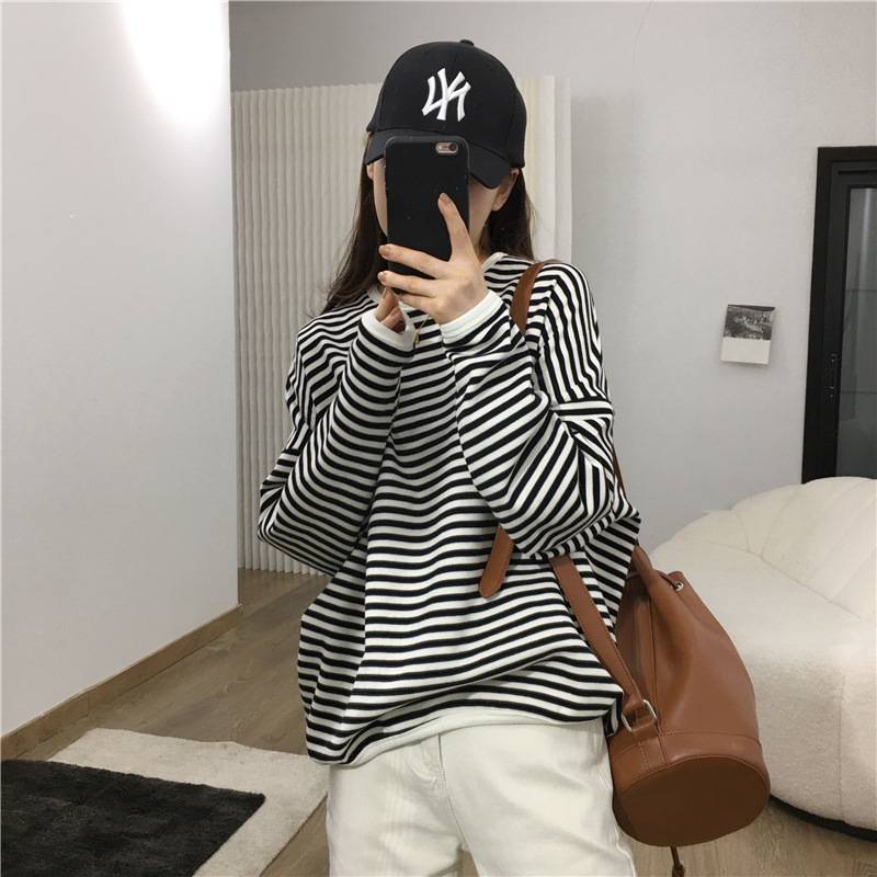 条纹卫衣女春秋薄款韩版宽松纯棉上衣慵懒风休闲外套