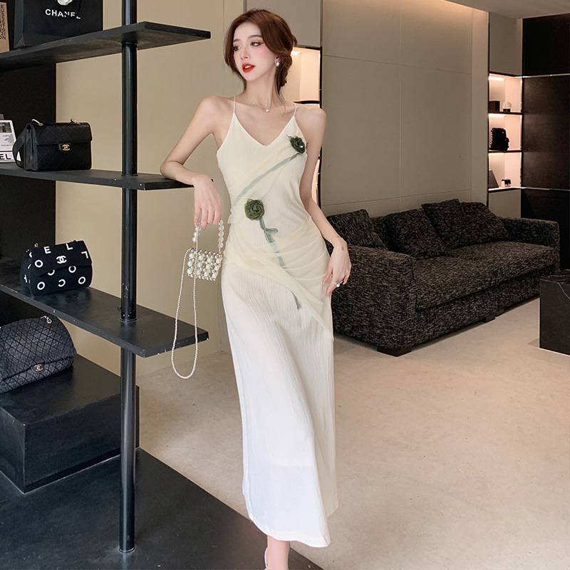 2023新款法式山茶花V领夏连衣裙修身显瘦气质吊带裙白色仙女裙子