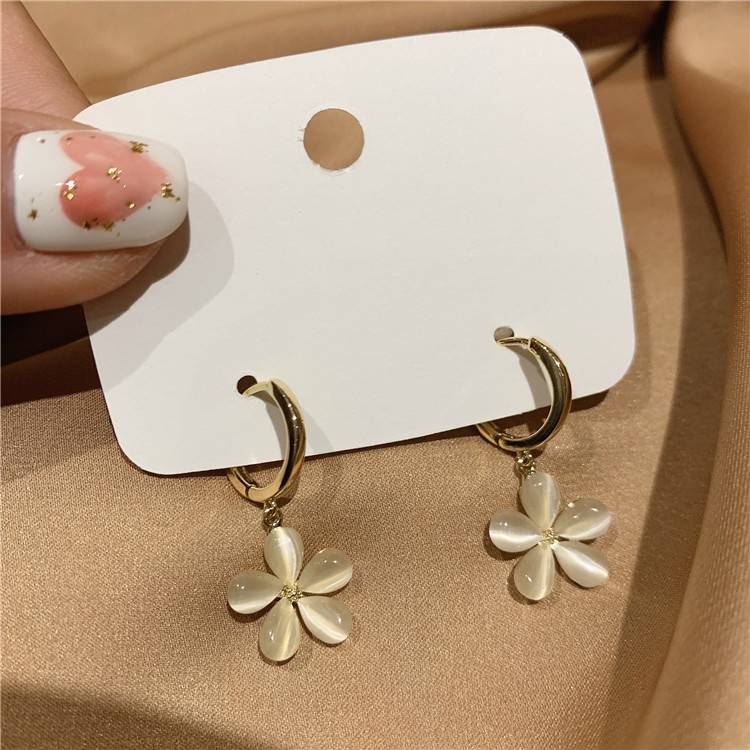 猫眼石五瓣花耳环S925纯银针耳钉镶锆蝴蝶花环耳饰个性简约清新