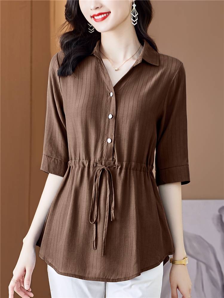 2023春秋新款气质上衣半袖妈妈宽松收腰系带小衫大码长袖雪纺衫女