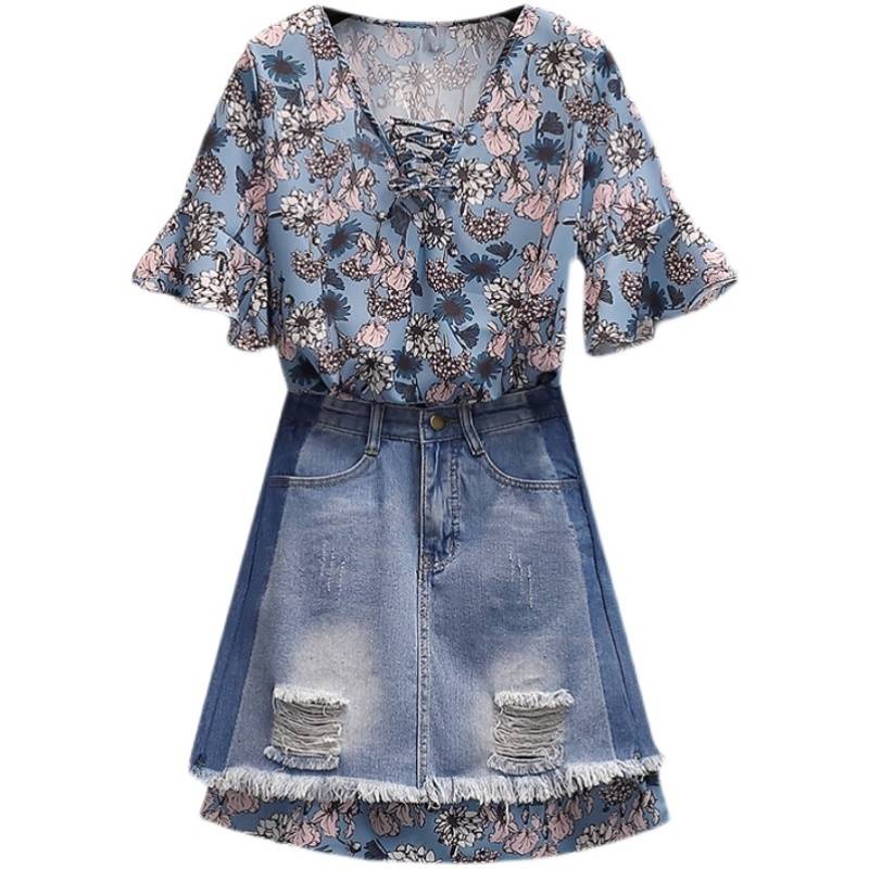 大码女装2021年夏装新款微胖妹妹时尚显瘦碎花连衣裙牛仔两件套装