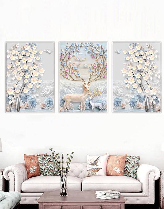 2018新款十字绣线绣三联画客厅大幅简约现代发财麋鹿欧式卧室满绣