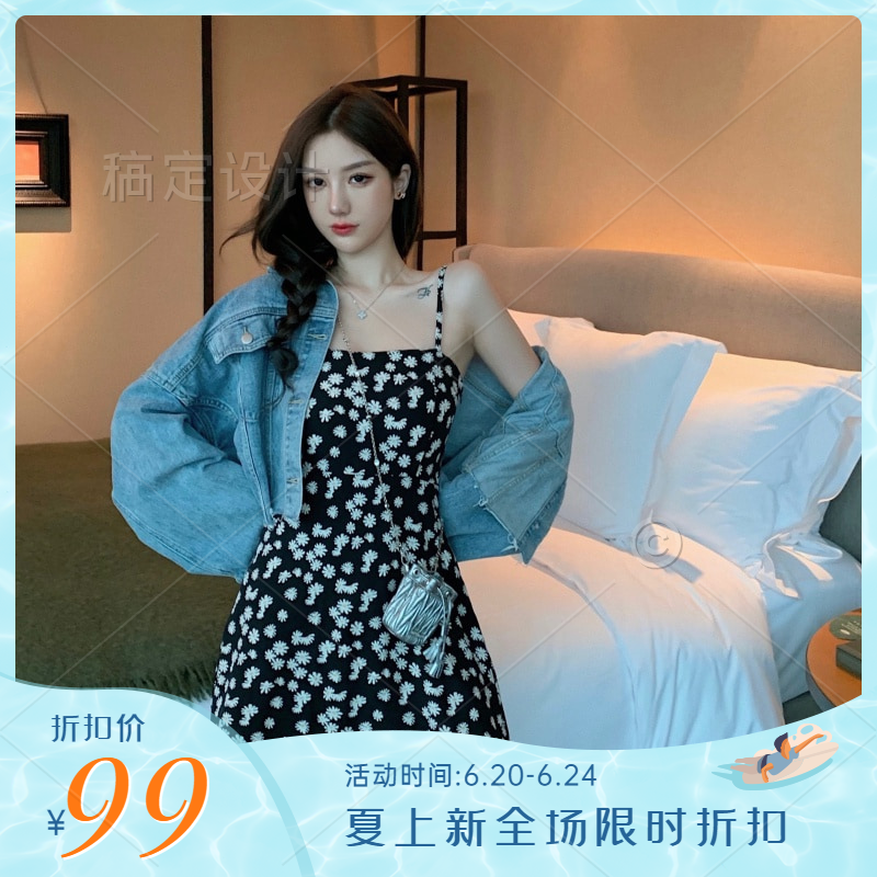 2020新款小碎花连衣裙A字吊带裙法式收腰桔梗裙