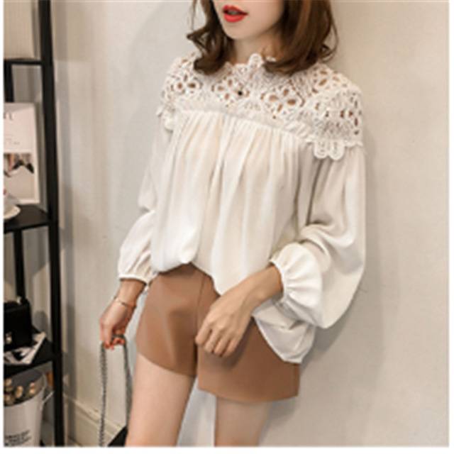 春装新款韩版大码宽松灯笼袖雪纺衫时尚蕾丝钩花镂空长袖打底上衣
