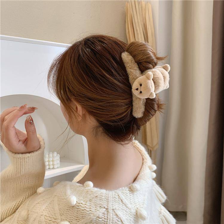奶咖系可爱毛绒发夹小熊卡通发卡网红简约夹子少女后脑勺BB夹发饰