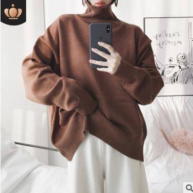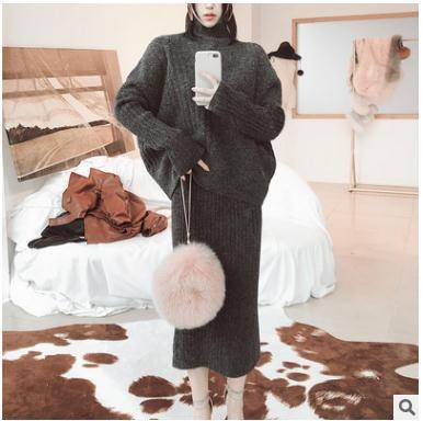 2018冬季新款女装 韩国纯色不规则高领加厚女士毛衣裙两件套套装