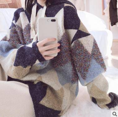 2018冬季新品女装 韩国兔毛几何连帽亮丝柔软加厚圣诞 限量版毛衣