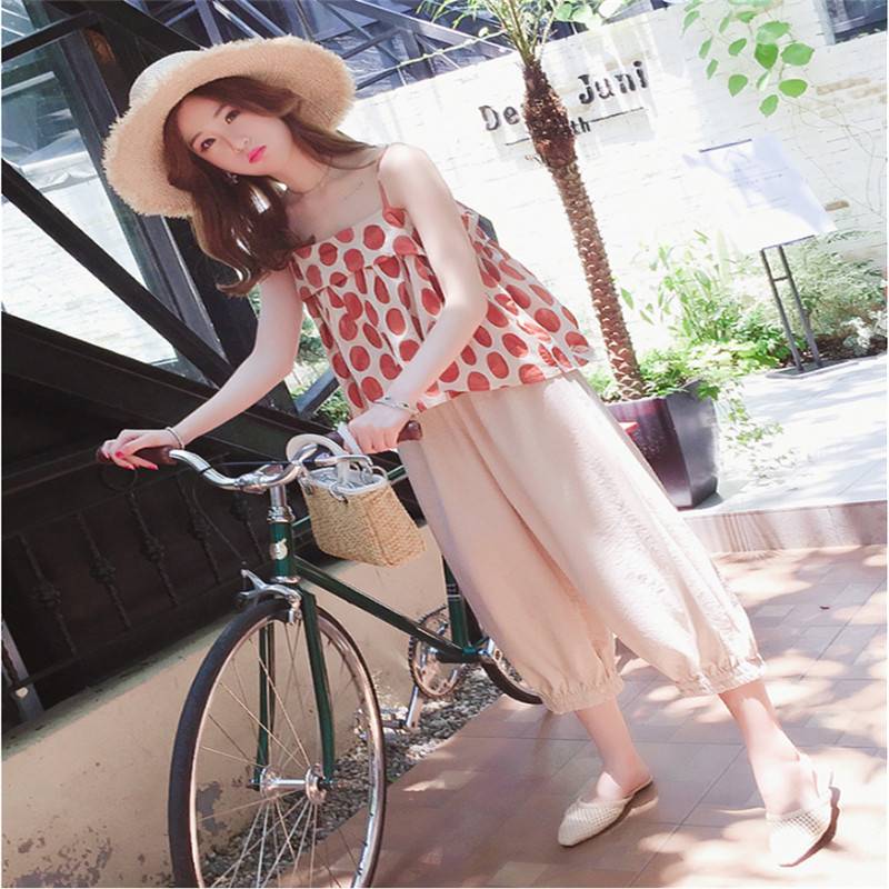 夏2018新款港味复古棉麻阔腿裤子套装女神漏肩波点吊带网红两件套