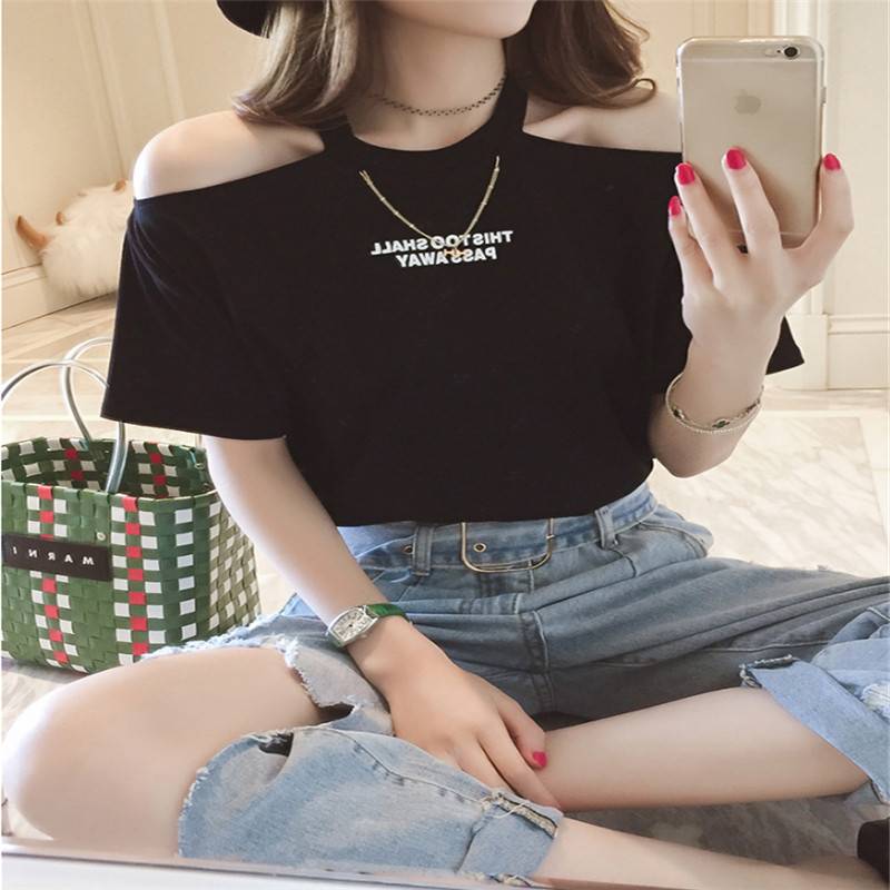 女装夏季新款一字露肩上衣女夏字母印花挂脖T恤女短袖体恤