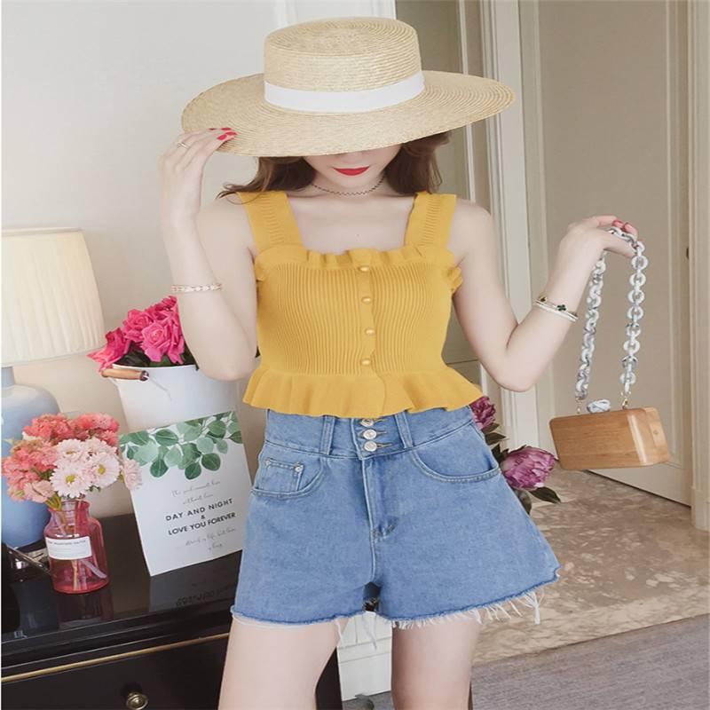 甜美木耳边设计冰丝针织显瘦短款外穿宽吊带背心女无袖上衣