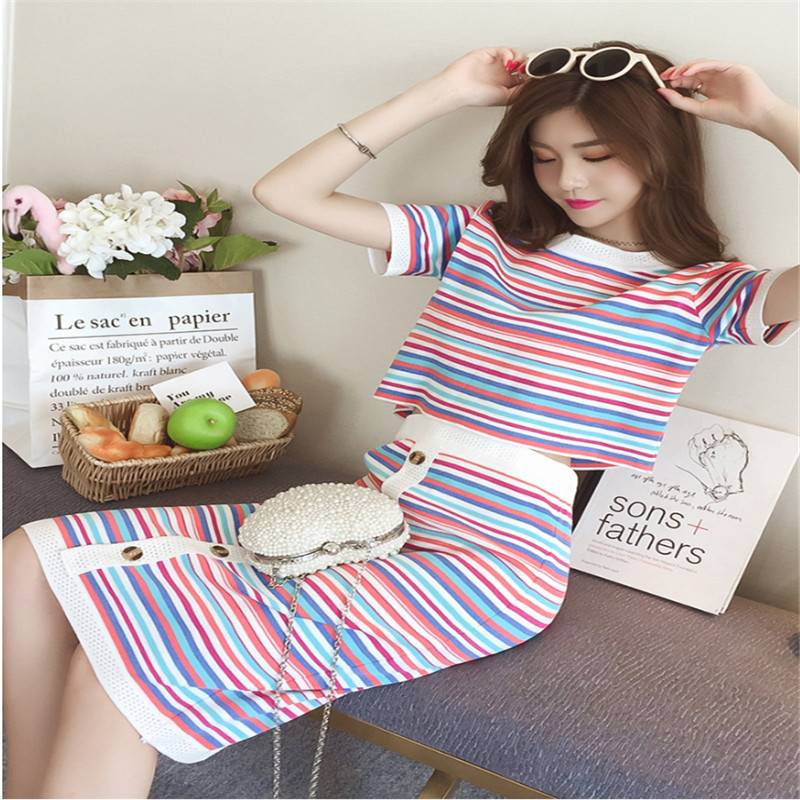 港味条纹针织套装女神范高腰包臀半身裙子网红两件套夏季2018新款