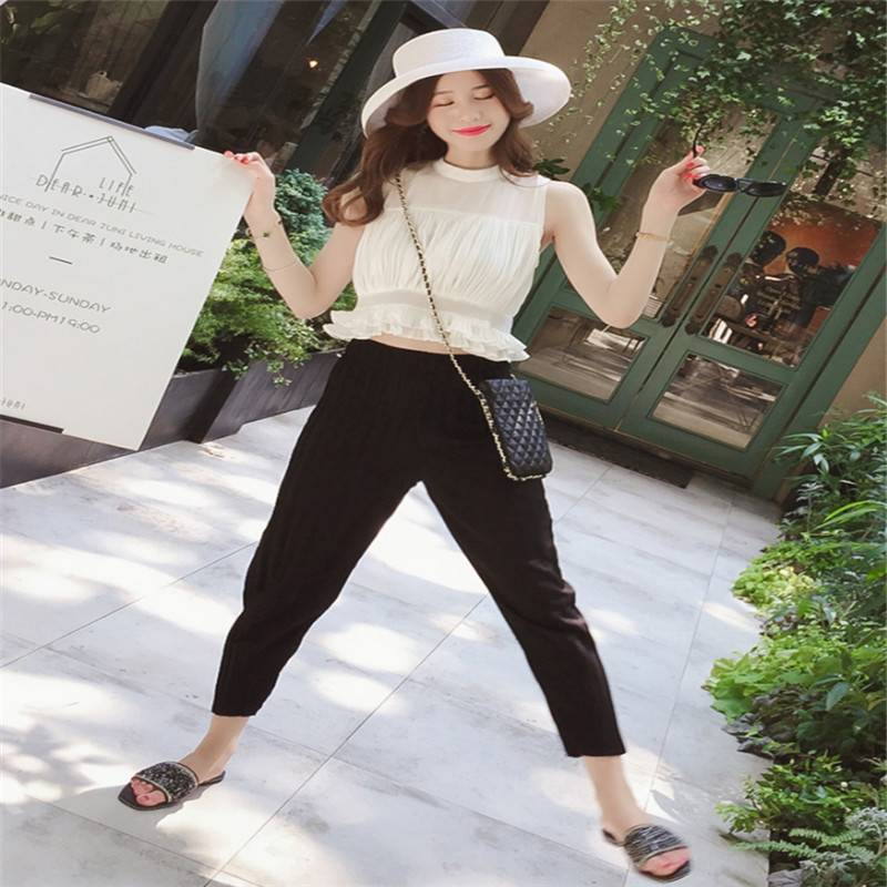 夏2018新款时尚无袖雪纺套装女精神范休闲小脚萝卜裤子社会两件套