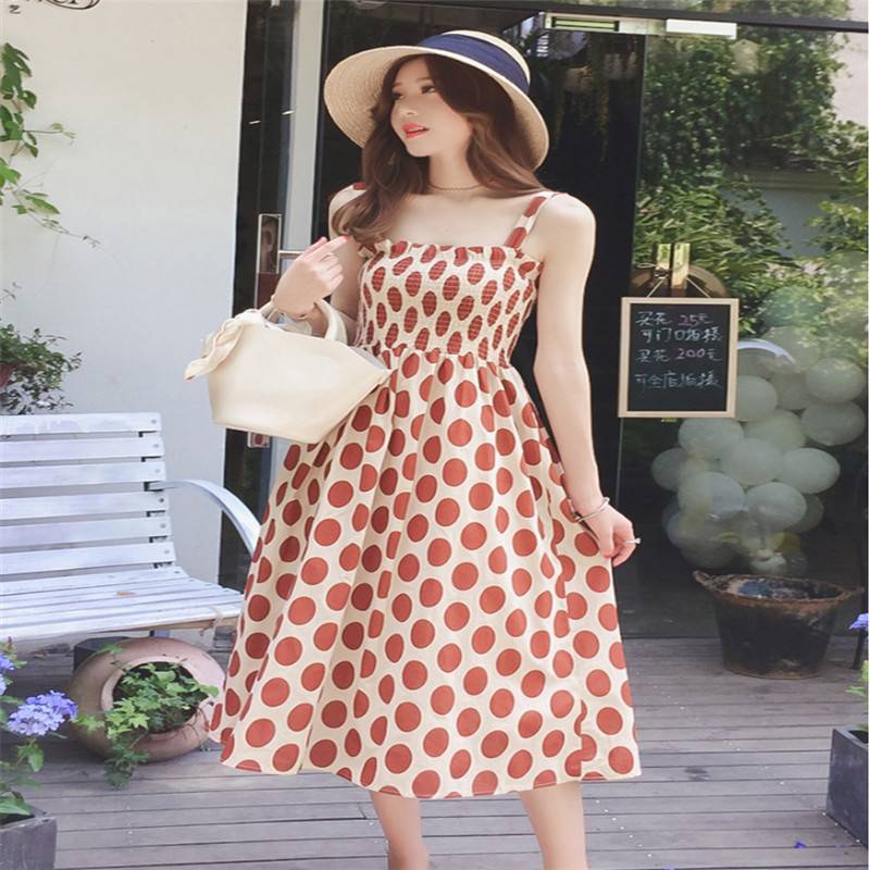 法式少女复古波点连衣裙吊带长裙收腰中长款沙滩裙子女夏2018新款
