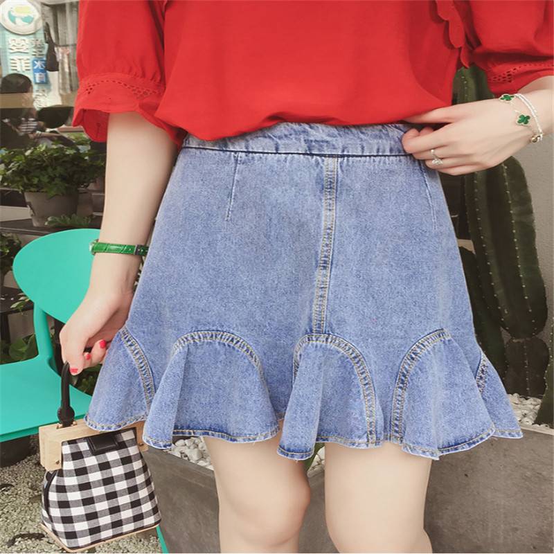 高腰牛仔半身裙女夏学生短裙荷叶边鱼尾裙子显瘦A字裙