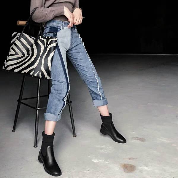 欧美2018新款圆头拼接弹力布袜靴厚底平底粗跟黑色马丁靴短靴女潮