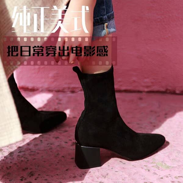 2018秋季新款短靴瘦瘦靴高跟方头袜靴女学生粗跟中筒黑色弹力靴子
