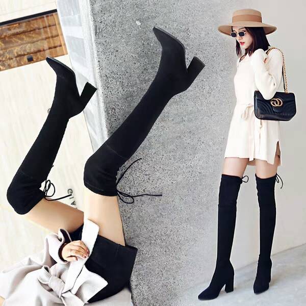 过膝长靴女靴高跟靴粗跟尖头2018秋冬季新款sw5050弹力过膝靴棉靴