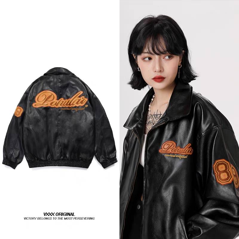 原创欧美复古刺绣机车皮衣男女高街嘻哈翻领韩版PU皮棒球服外套
