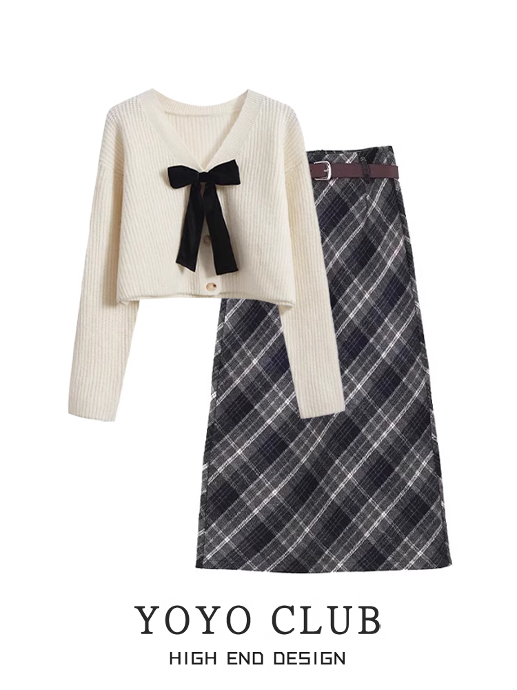 法式短款V领针织衫冬季复古格纹套装 85.00 已售:0件