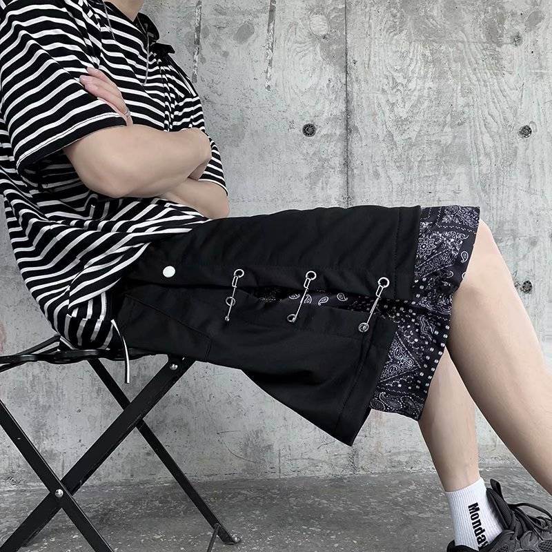 实拍潮牌别针假两件拼接腰果花短裤子男高街ins潮宽松韩版潮流夏