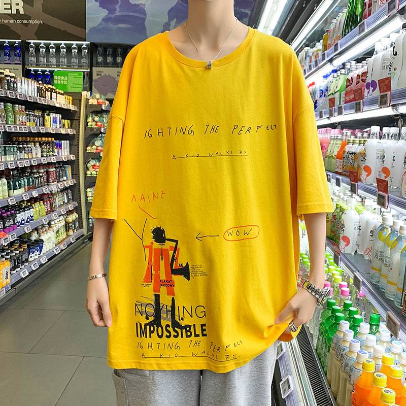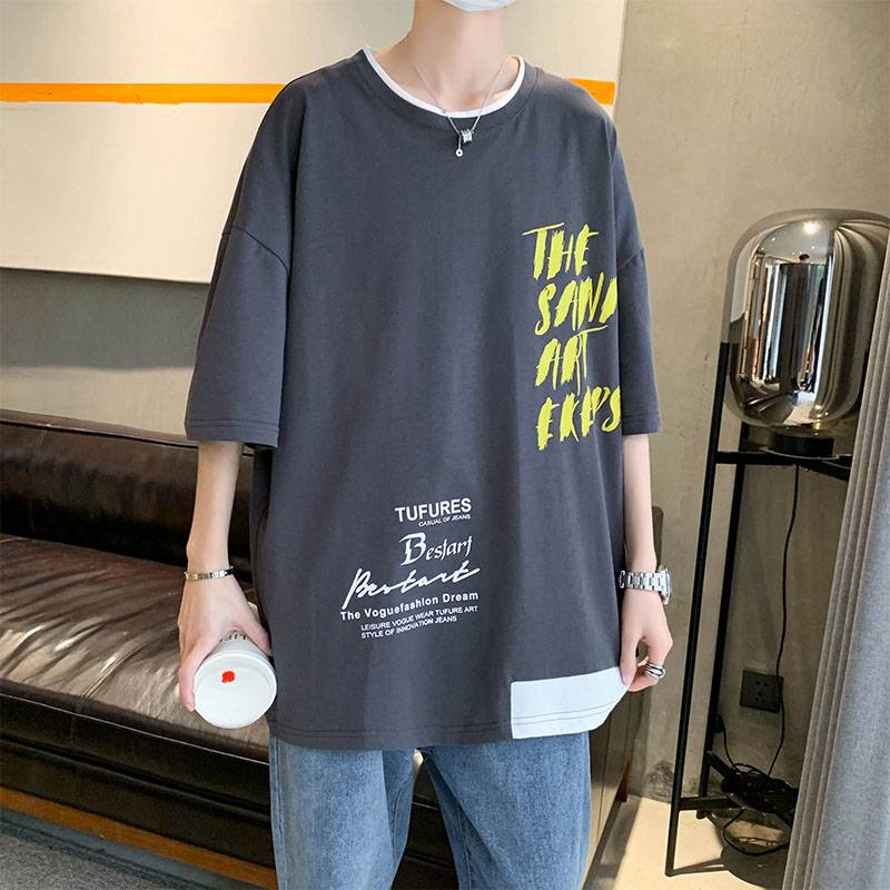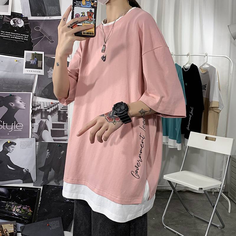 夏季新款 港风海报墙大码假两件短袖T恤