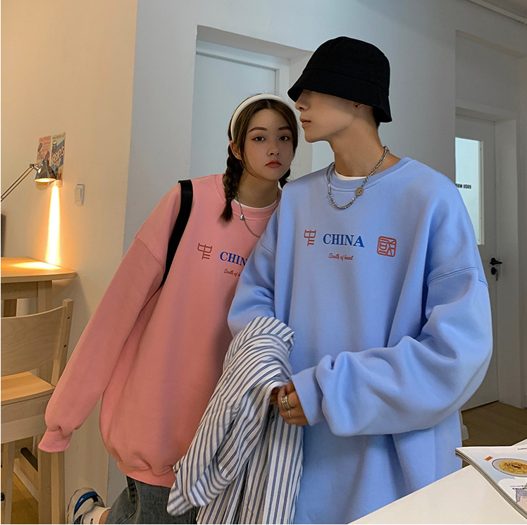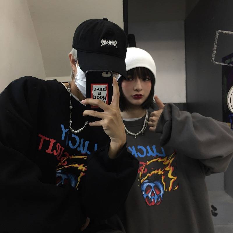 2021秋冬新款暗黑火焰字母印花圆领加绒卫衣外套宽松长袖上衣女潮