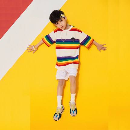 嘻哈儿童街舞服装彩虹条纹短袖hiphop演出服少儿街舞套装男童潮流