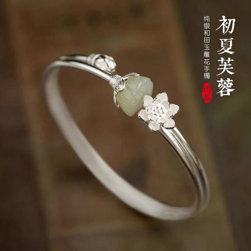 足银999天然和田玉银手镯莲花手环沉花簪步离镯不离镯 579.00 已售:0件