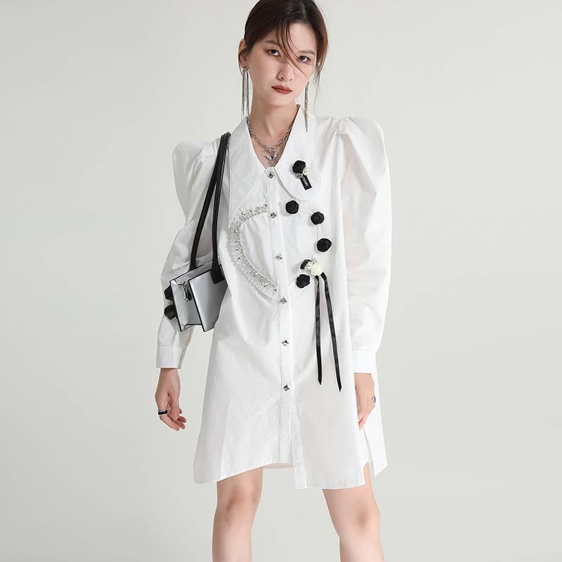 2022新款不规则立体花朵拼接心形衬衫裙女 修身显瘦泡泡袖连衣裙