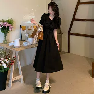 泡泡袖连衣裙2025新款夏季女装性感露背气质中长款温柔风a字裙子