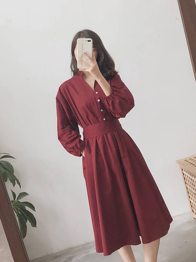 赫本风小红裙气质chic早秋裙子初秋女装长袖收腰中长款衬衫连衣裙