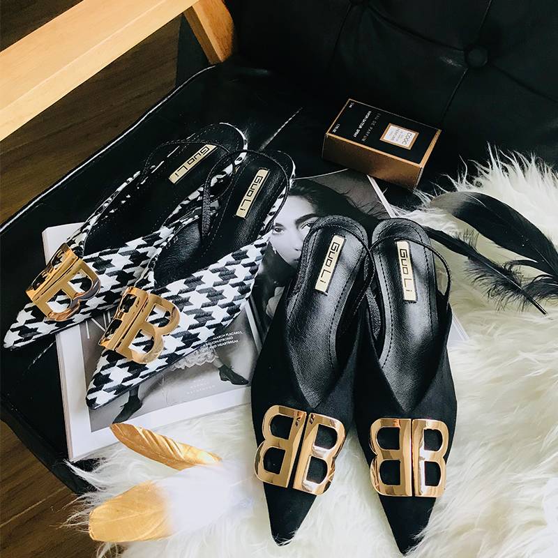 2018新款夏季仙女尖头双B拖鞋网红同款金属扣温柔低跟穆勒女凉鞋
