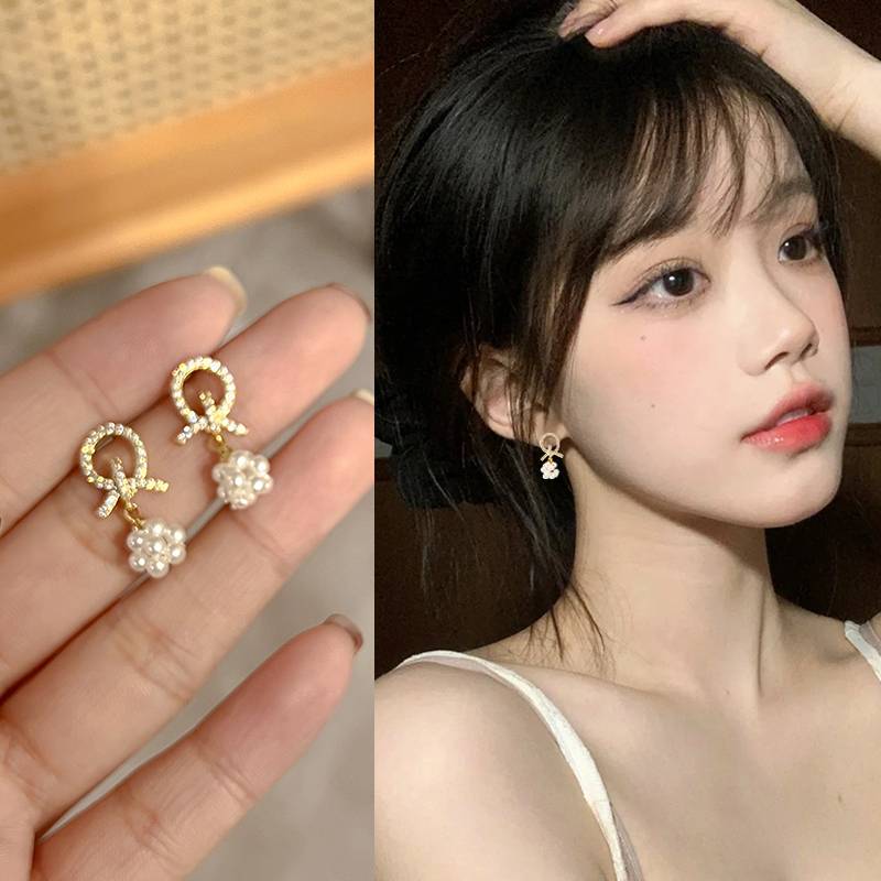 气质蝴蝶结珍珠耳钉女2023年新款潮高级感小众设计感纯银耳环耳饰