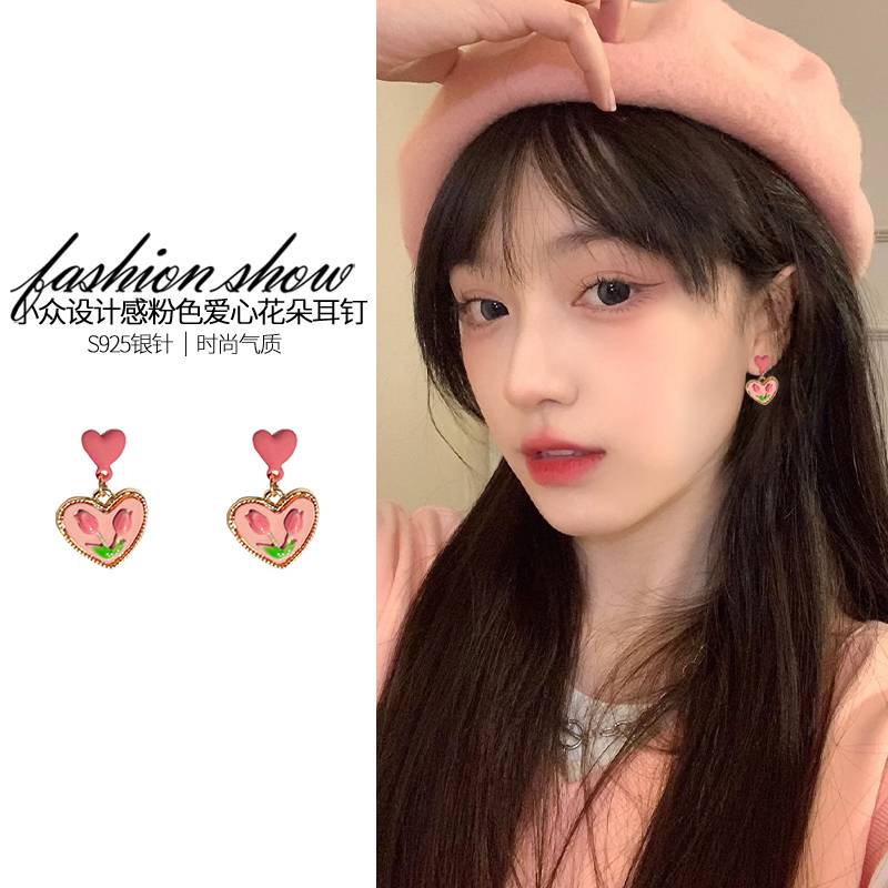 粉色气质耳环女可爱2023年新款潮小众设计高级感纯银森系耳钉耳饰