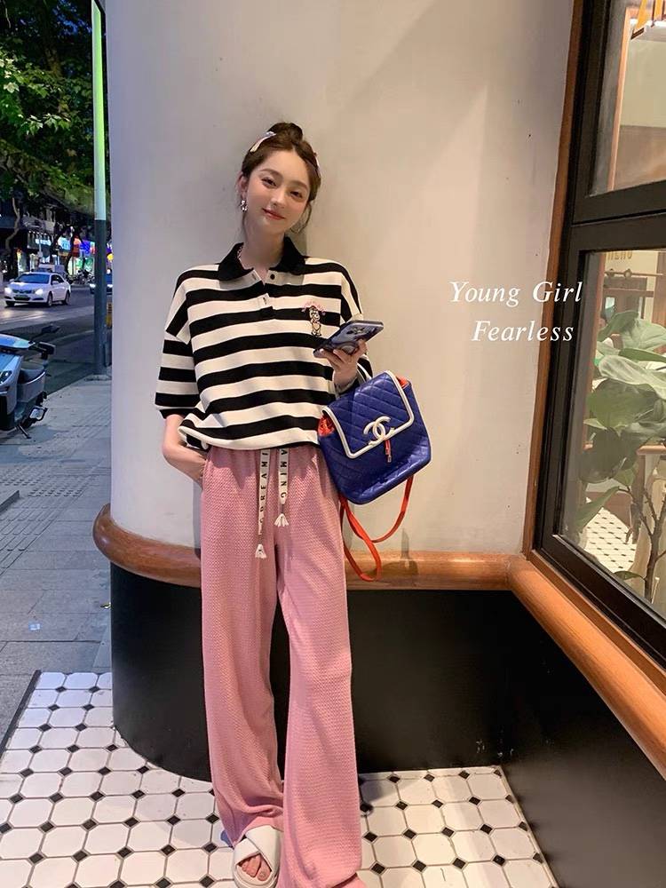 2022小明定制夏季新款条纹鬼马盐系少女风小熊polo衫翻领百搭t恤