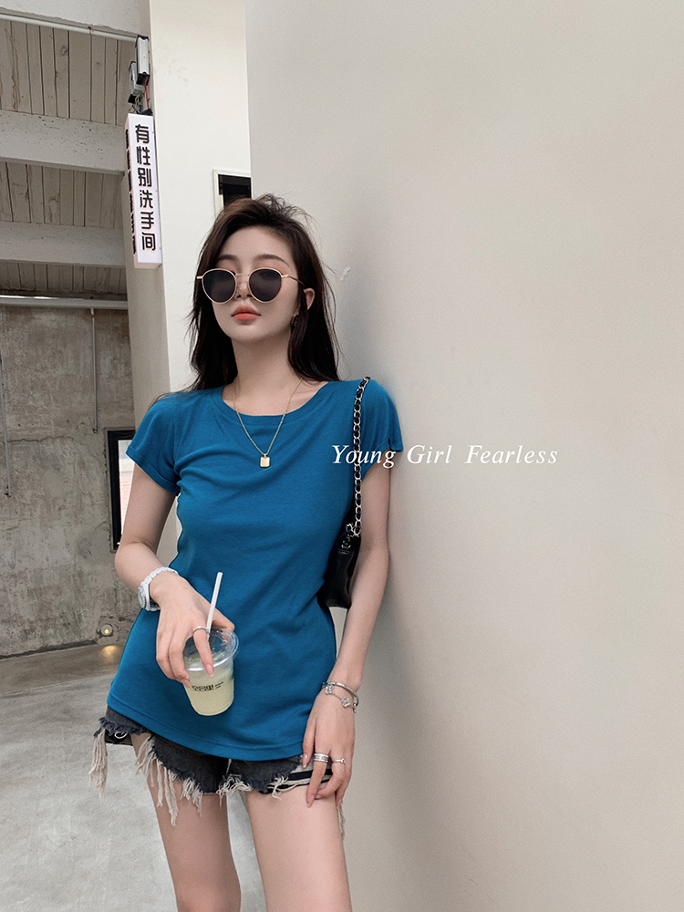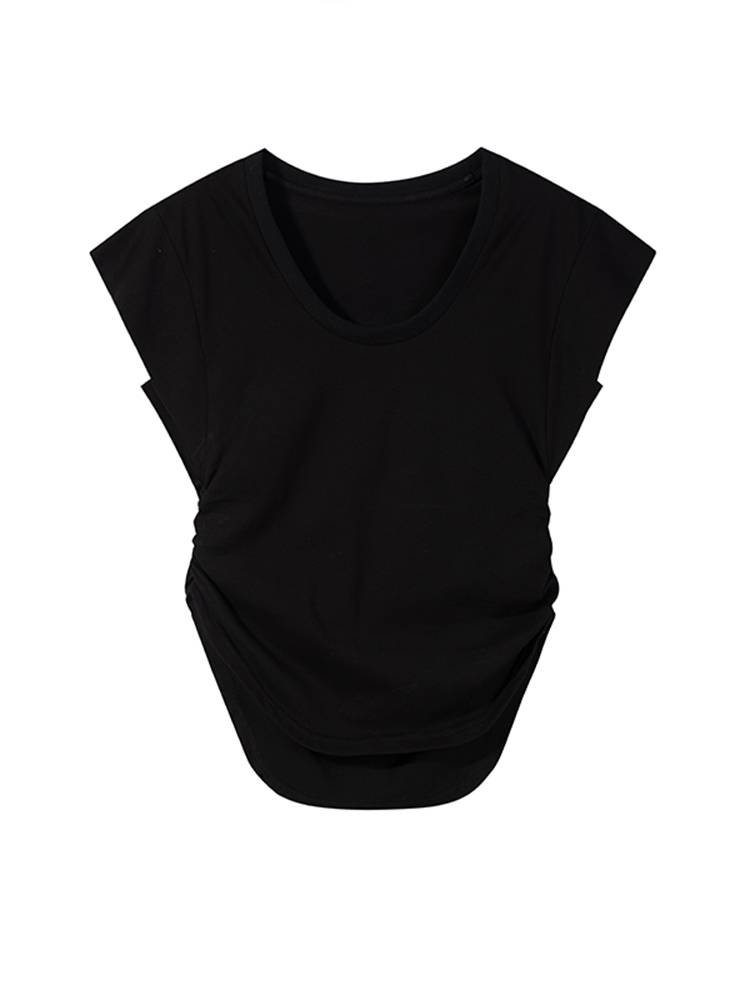 小明定制 夏季u领宽松甜辣妹上衣小心机褶皱短袖遮肉百搭t恤女