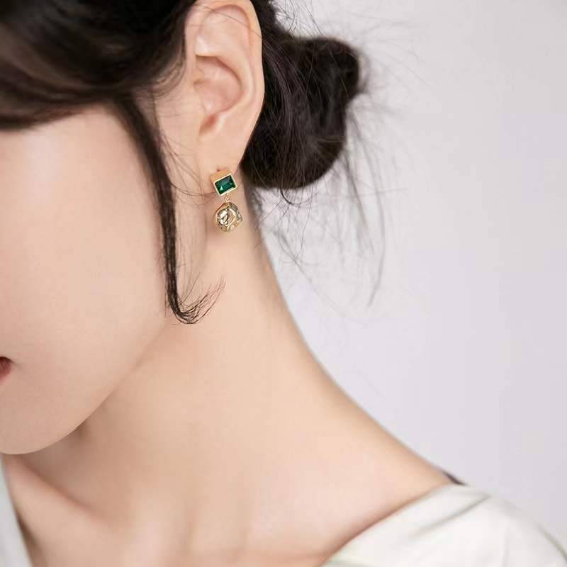 复古绿色方形耳钉温柔港风耳环气质名媛耳夹女无耳洞小众秋冬耳饰
