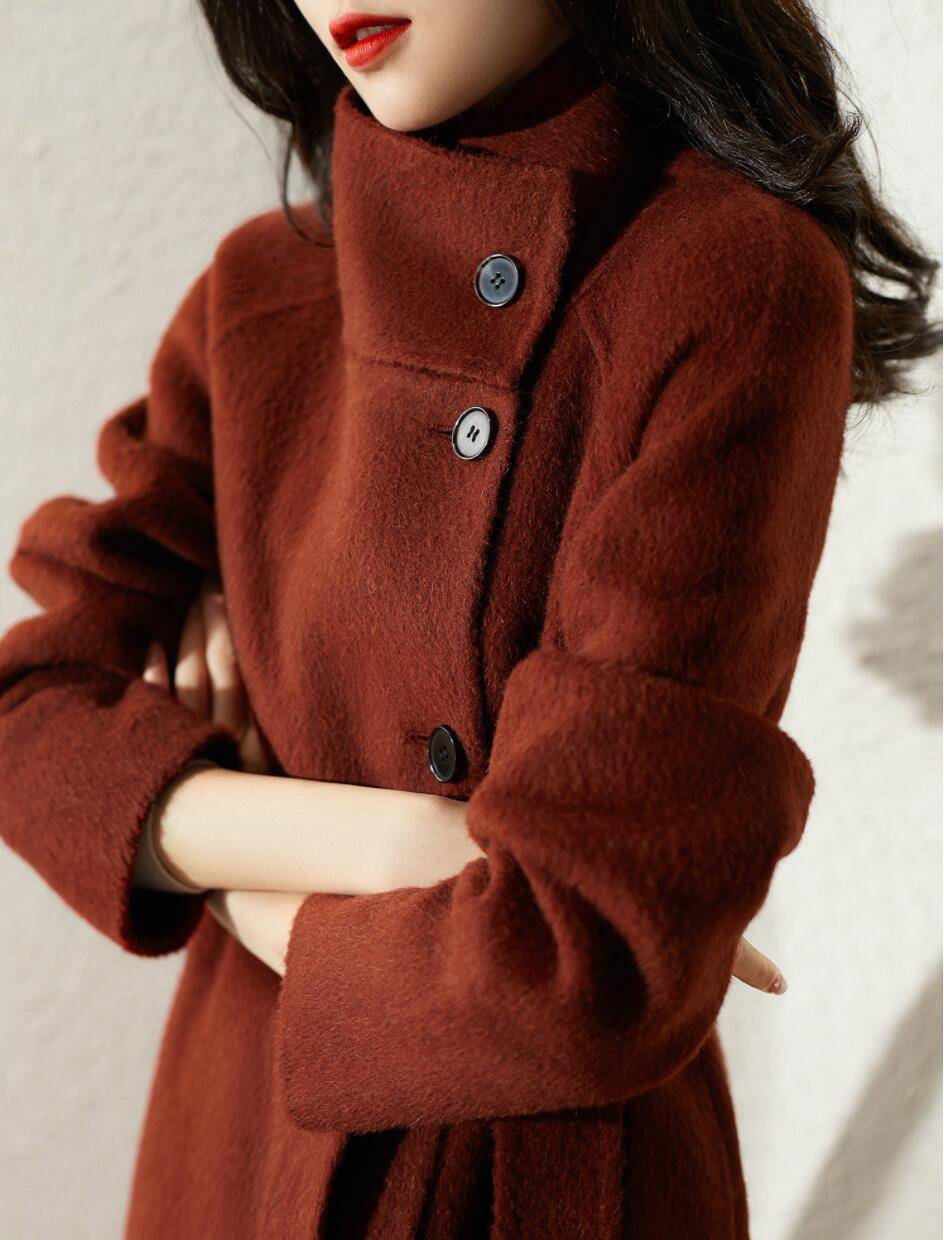 DYA362179VG]赫本风斜襟立翻领 养肤杉红色羊驼毛羊毛双面大衣女