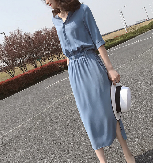 蓝色开叉长裙2018春夏新款女装韩版收腰显瘦气质中袖雪纺连衣裙女 120.00 已售:0件